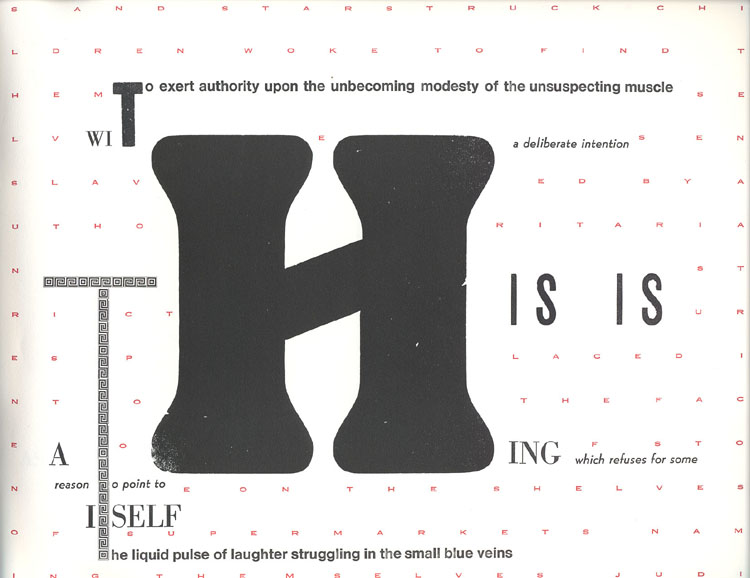 Here, letters being are into sizes which allow them to span more than one phrasal unit. The reader of the work must abandon most traditional left-to-right, top-to-bottom reading in order to navigate the text, and the work exposes how the spatial arrangement of the text can force associative links from one side of the page to another.